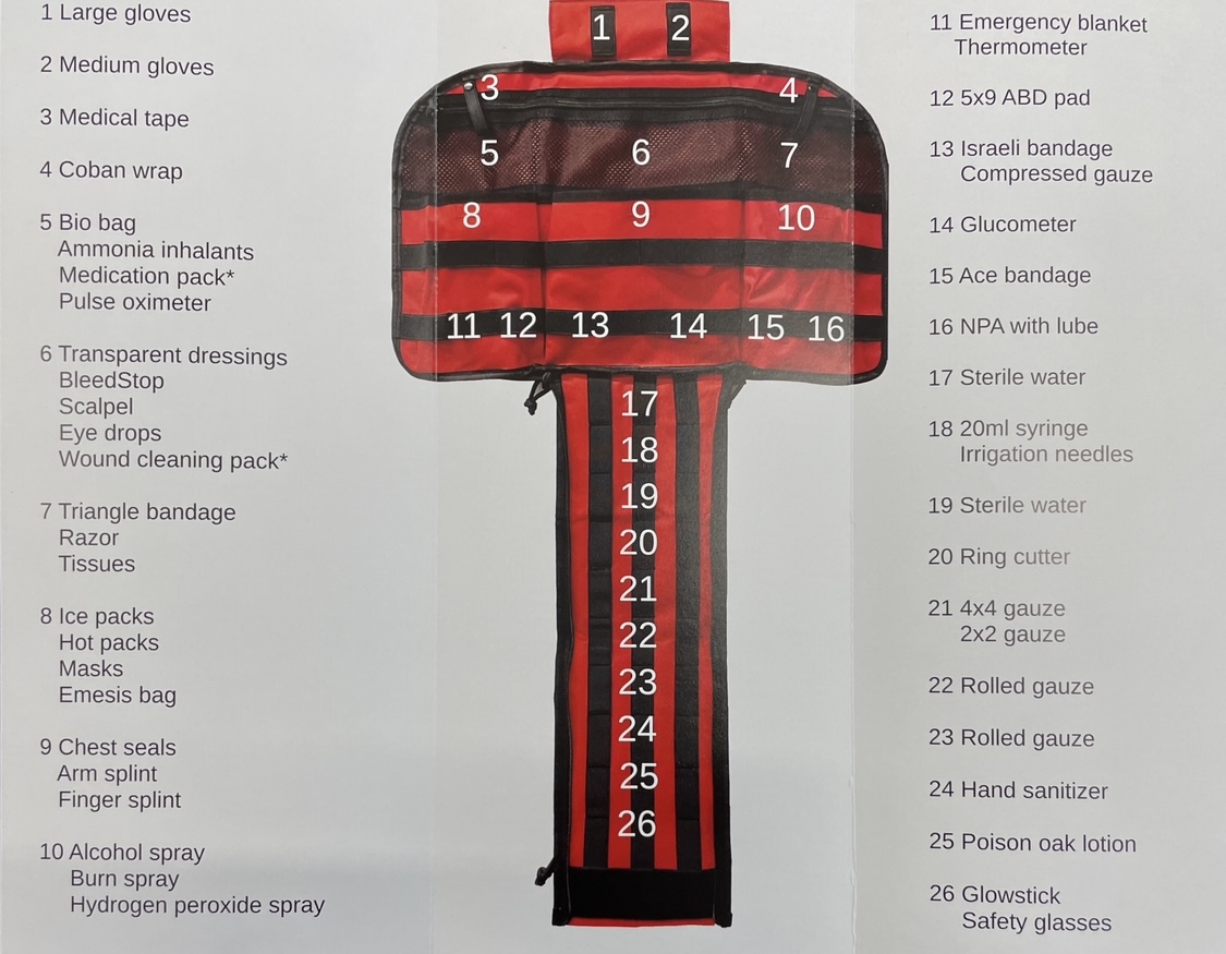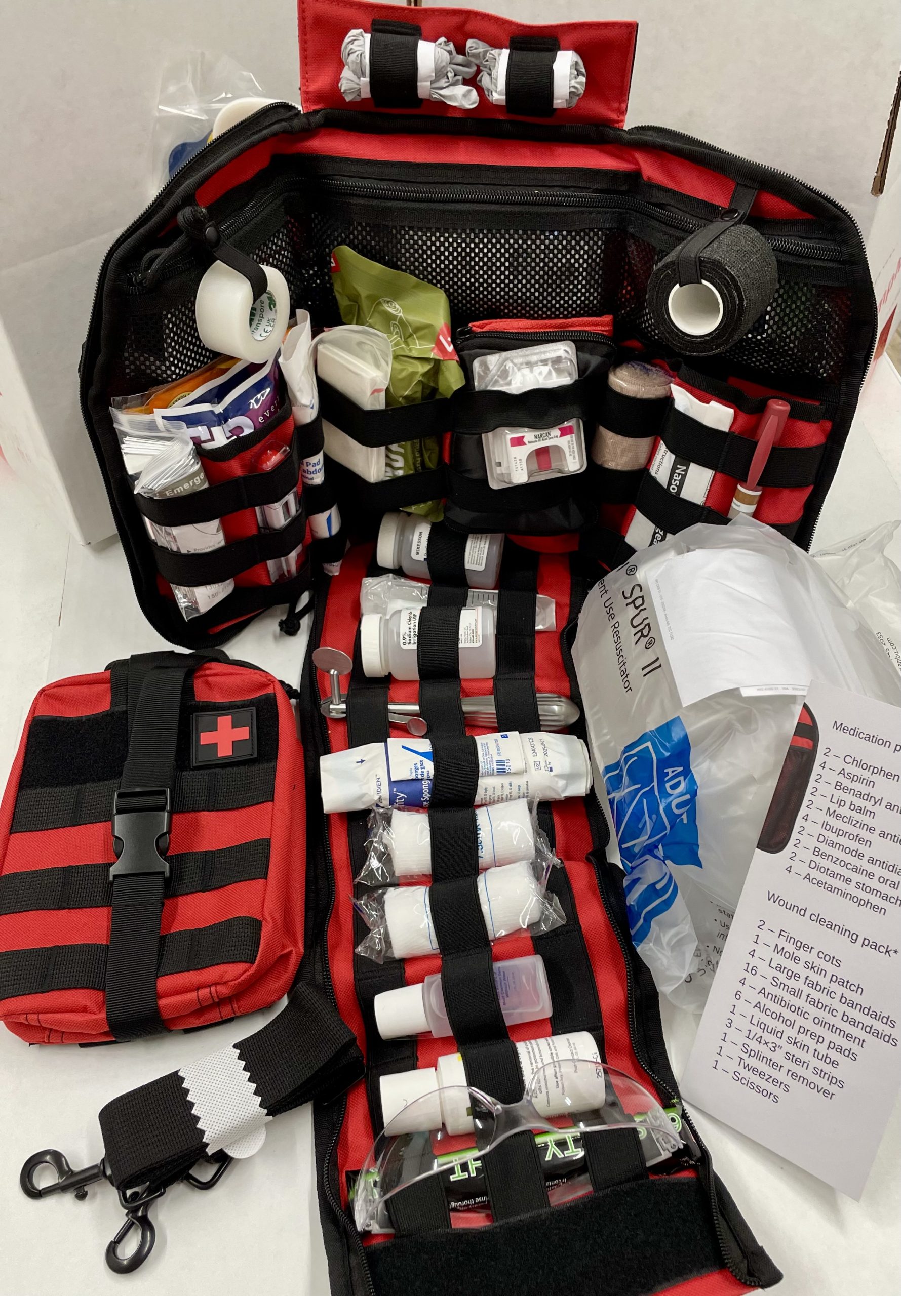 The Elite Gen 3 model is intended for use by individuals with appropriate emergency medical training and includes professional-grade emergency medical components such as Narcan, a pleural decompression needle, suture kit, BVM, skin stapler and remover, large trauma dressing, and a cervical collar.